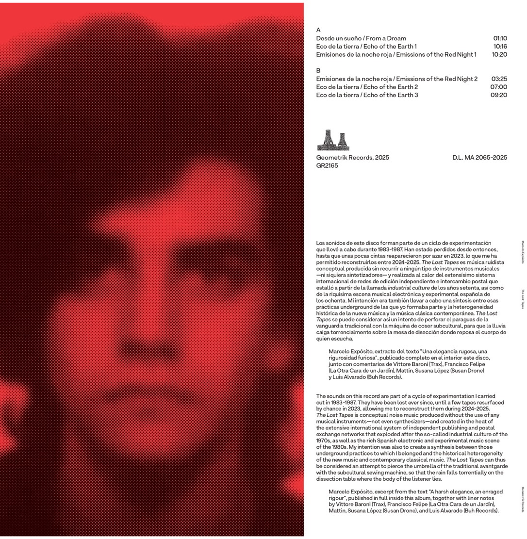 Geometrik Records se complace en contribuir una vez más a recuperar en exclusiva la obra inédita de Marcelo Expósito que se encontraba perdida desde su realización original en los años ochenta. Marcelo Expósito es uno de los artistas españoles contemporáneos de mayor recorrido internacional, cuya obra se expone en países de Europa y Latinoamérica, así como un reconocido crítico cultural que publica regularmente desde hace varias décadas. Pero inició su trayectoria muy joven en la época de las experimentaciones sonoras crecidas al calor de la denominada cultura industrial, que tuvo en España un territorio de actividad especialmente fecundo. Coeditor de publicaciones legendarias como el fanzine Experiencias (1983) y, sobre todo, de la editora de fanzines-casete Necronomicón (1983-1987) que operó a escala internacional, Marcelo Expósito viene reconstruyendo en los últimos años aquellas de sus experimentaciones sonoras que durante décadas han estado perdidas.